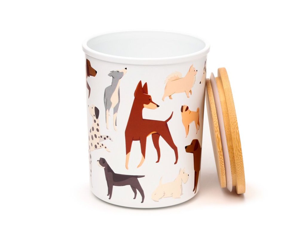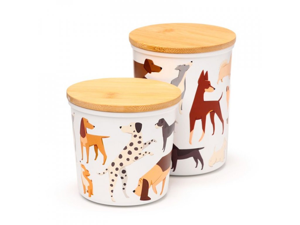 Sada dvou praktických úložných dóz z ekologického materiálu RPET a elegantního bambusového víčka se silikonovým těsnění. Dózy mají krásný design pejsků a jistě se budou hodit nejen do kuchyně na různé oříšky, sušenky a jiné dobroty, ale i jinde v domácnosti.